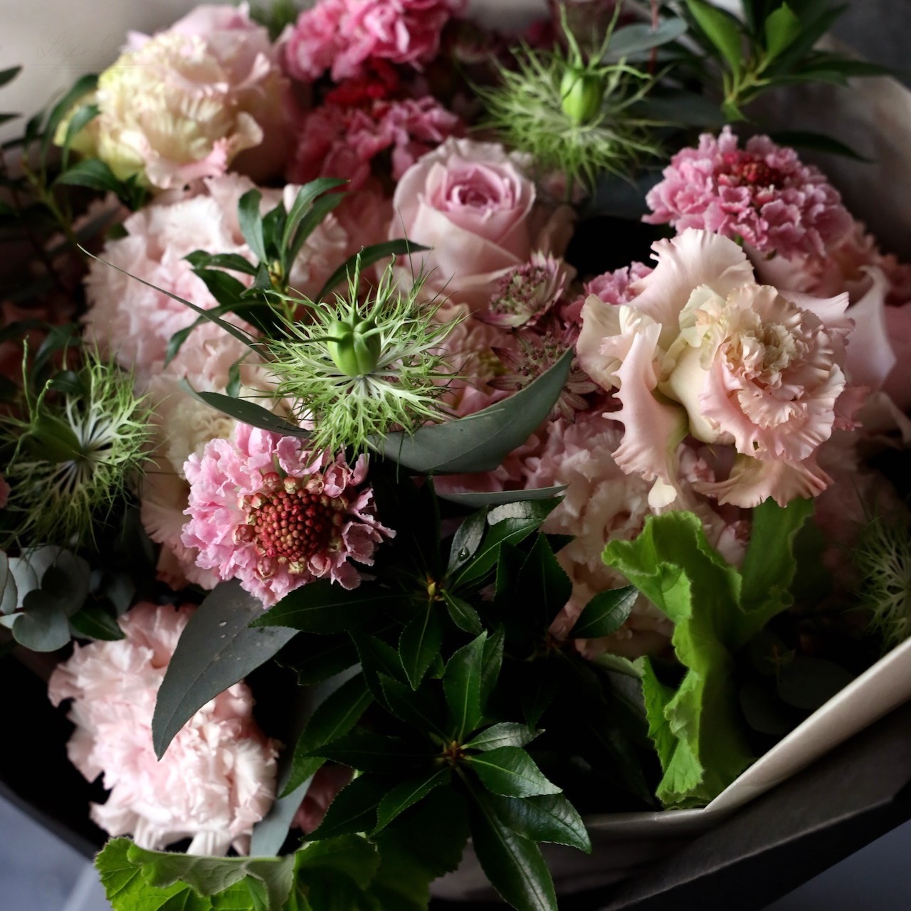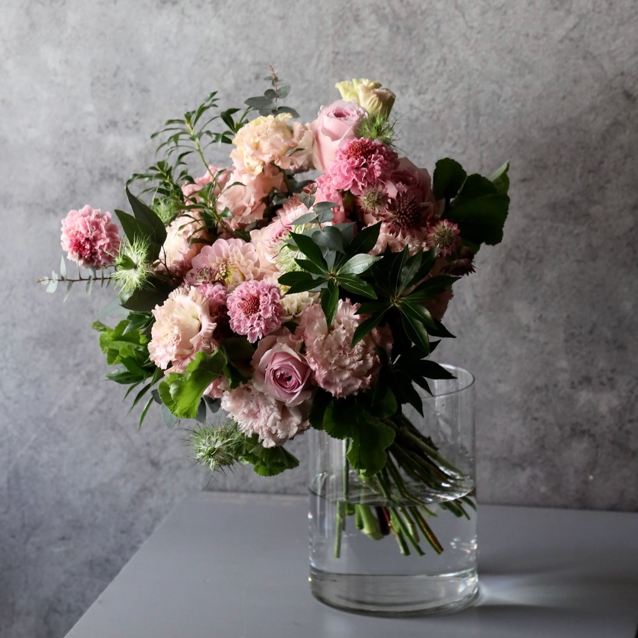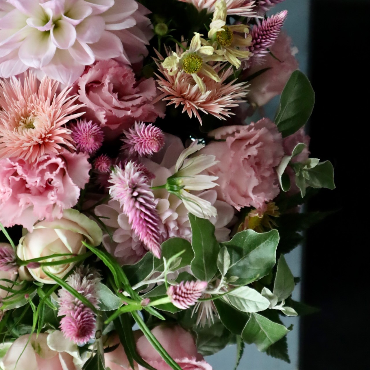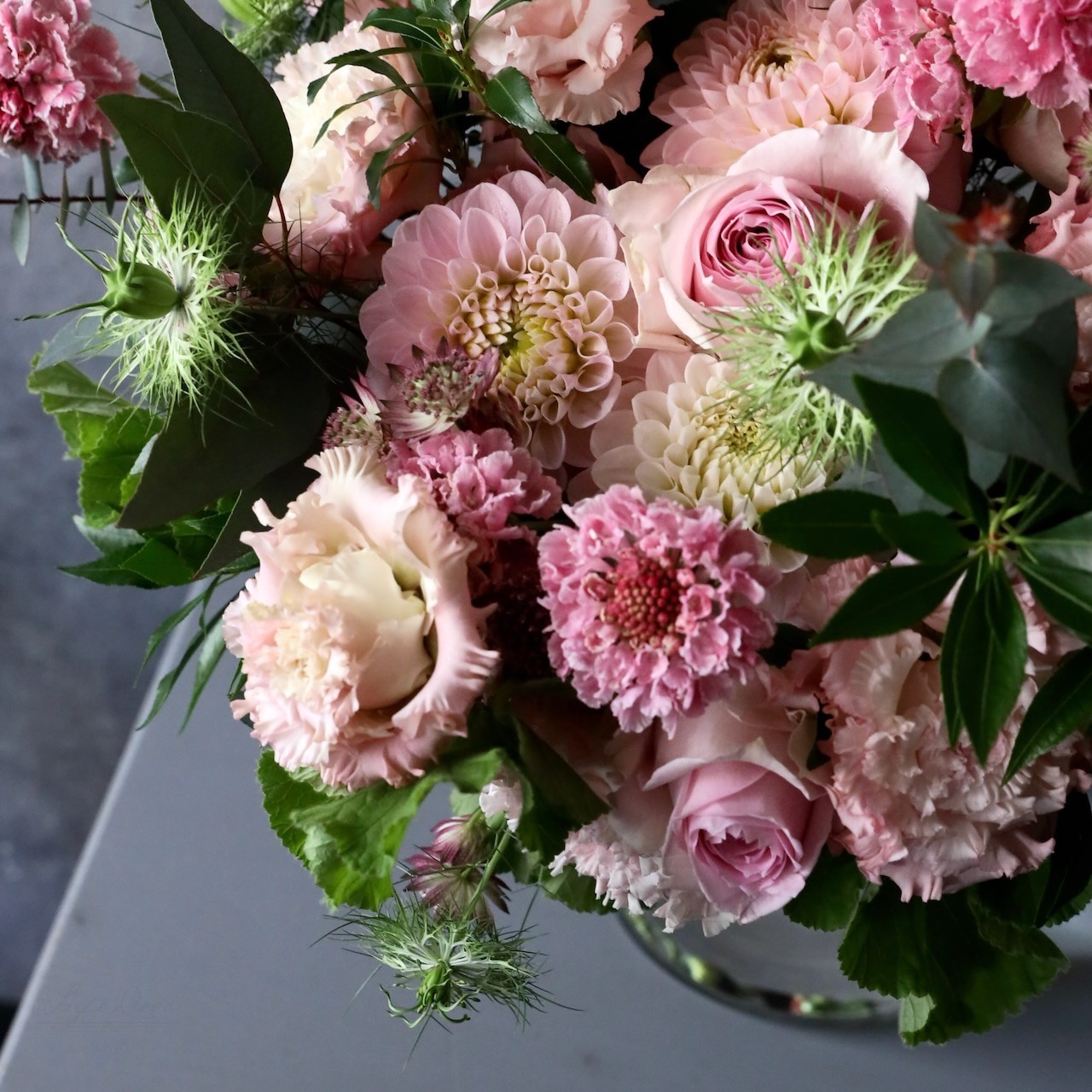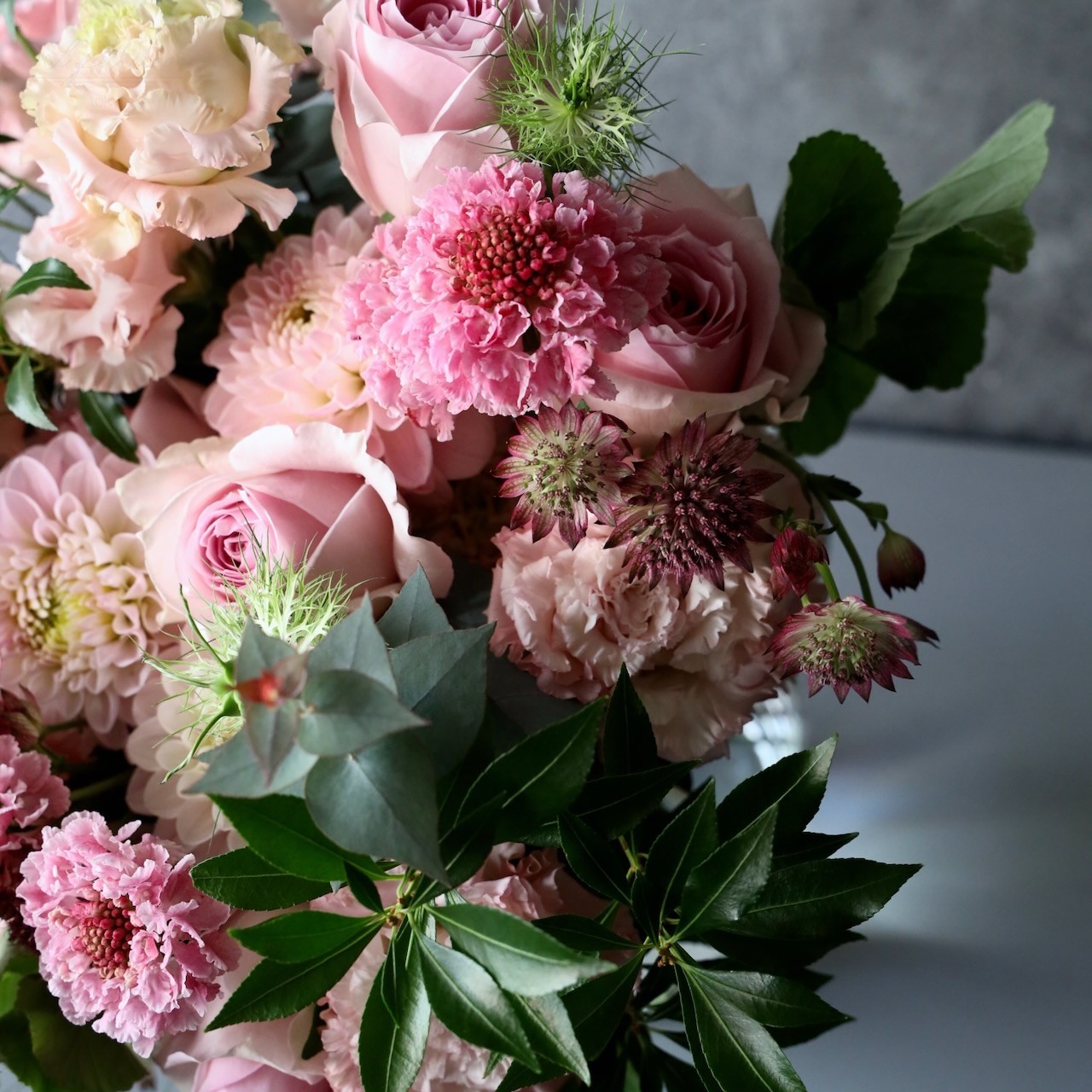 アレンジメントM「白桃 hakuto」どことなく水彩画のような優しげな奥行き感 レディライクなホワイト&ピンク