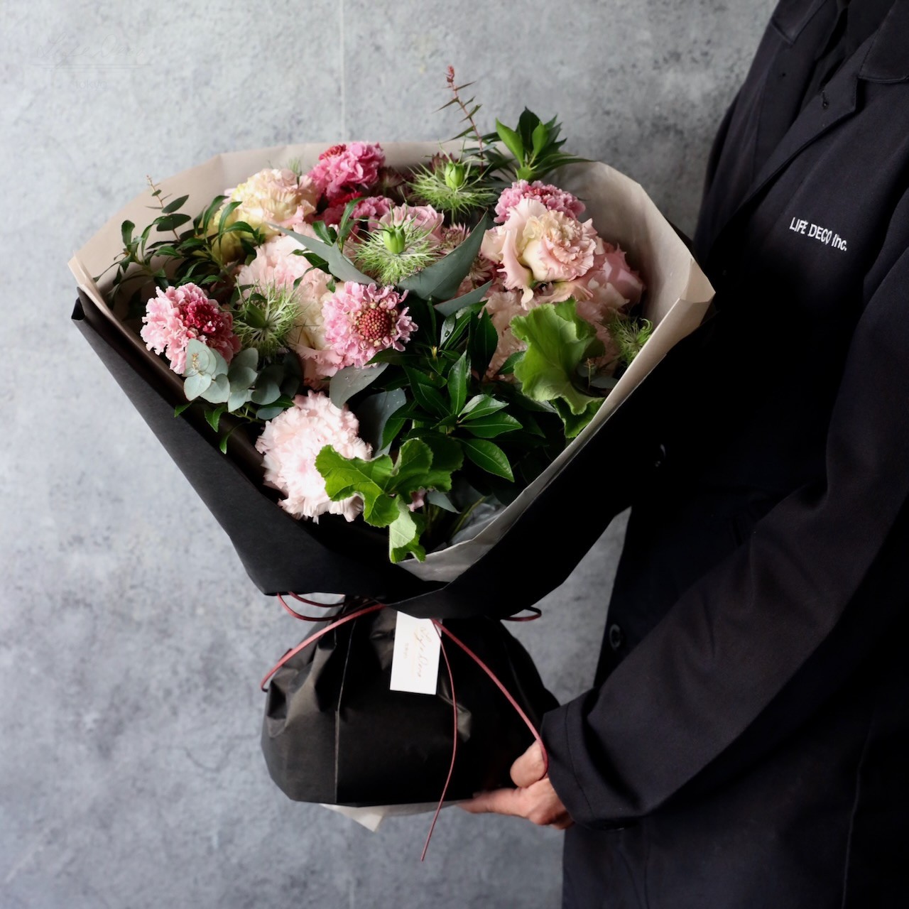 アレンジメントL「白桃 hakuto」どことなく水彩画のような優しげな奥行き感 レディライクなホワイト&ピンク