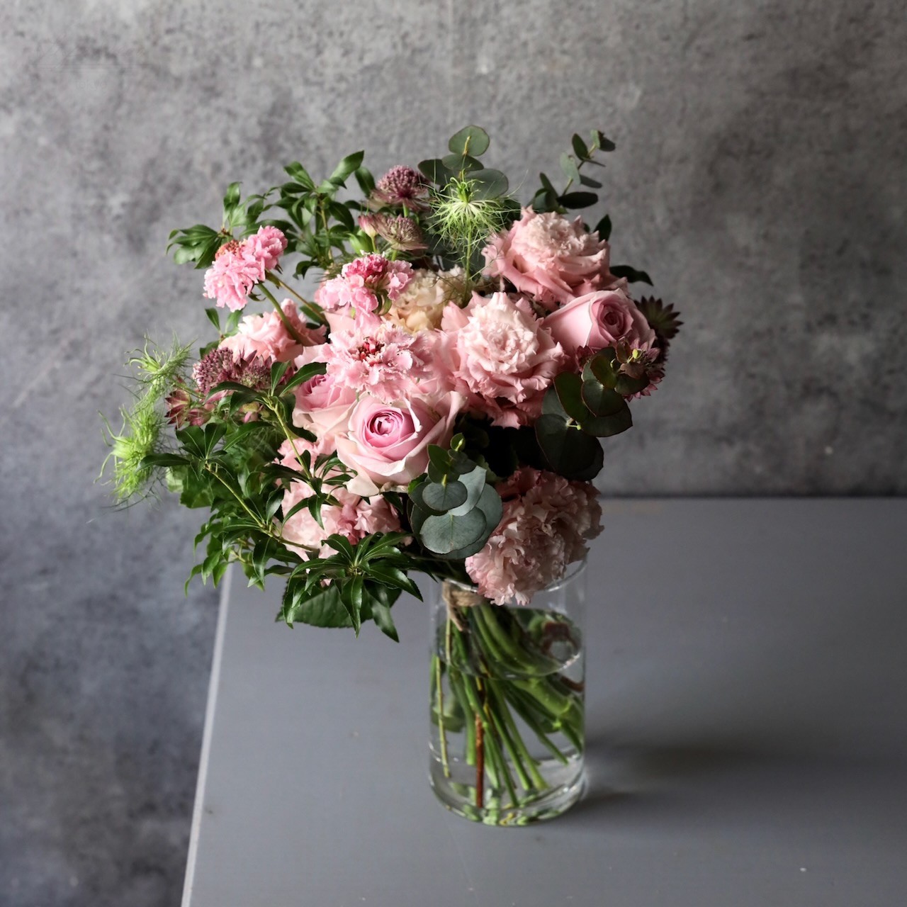 アレンジメントM「白桃 hakuto」どことなく水彩画のような優しげな奥行き感 レディライクなホワイト&ピンク