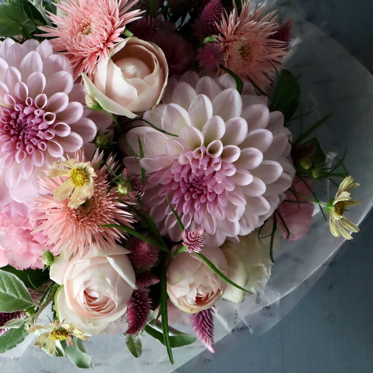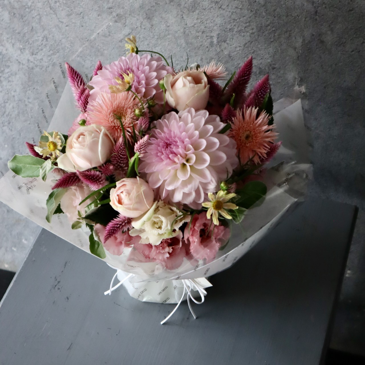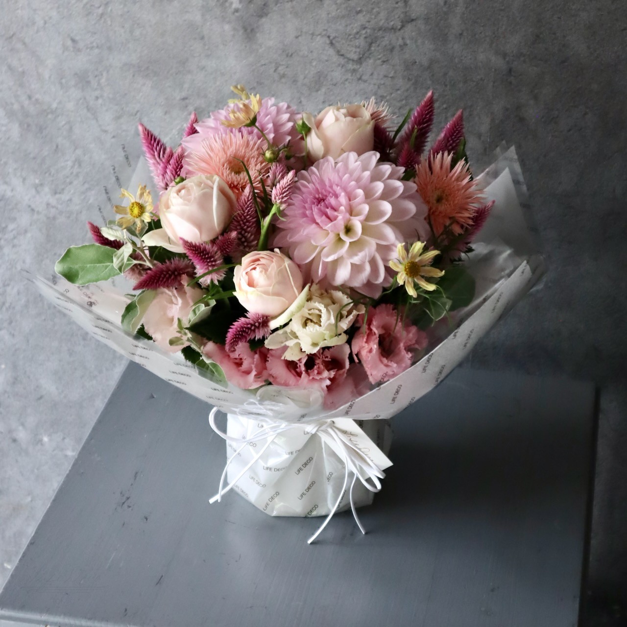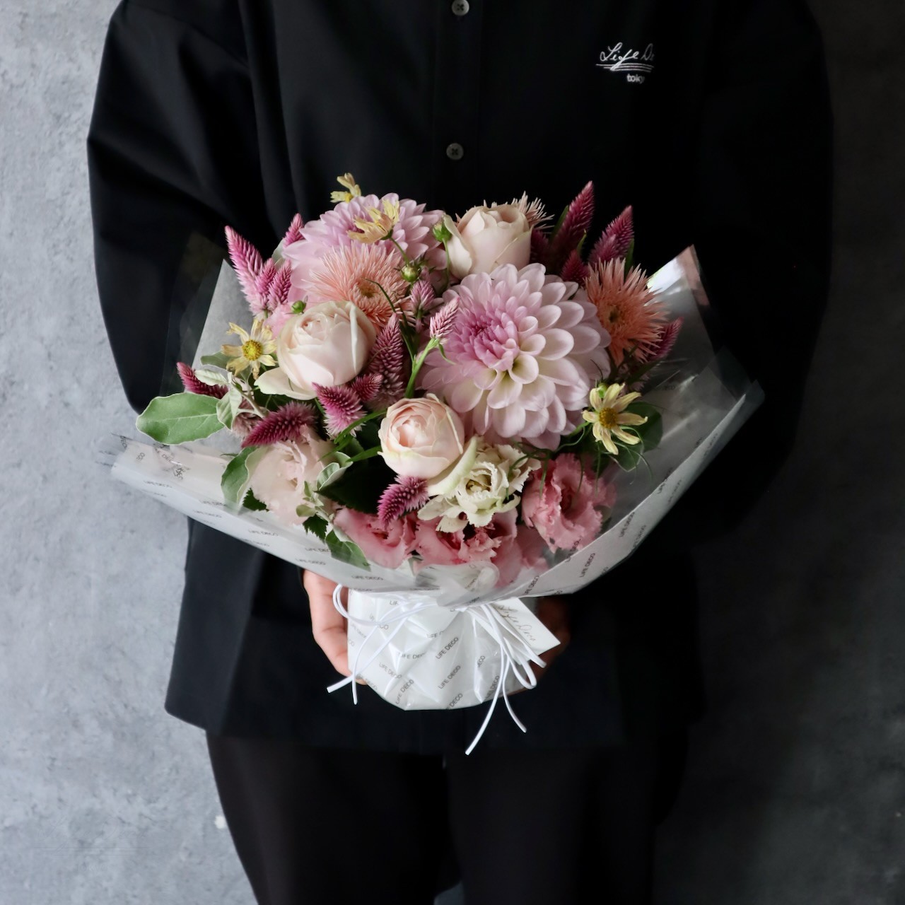 アレンジメントL「白桃 hakuto」どことなく水彩画のような優しげな奥行き感 レディライクなホワイト&ピンク